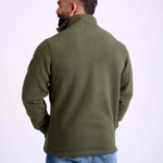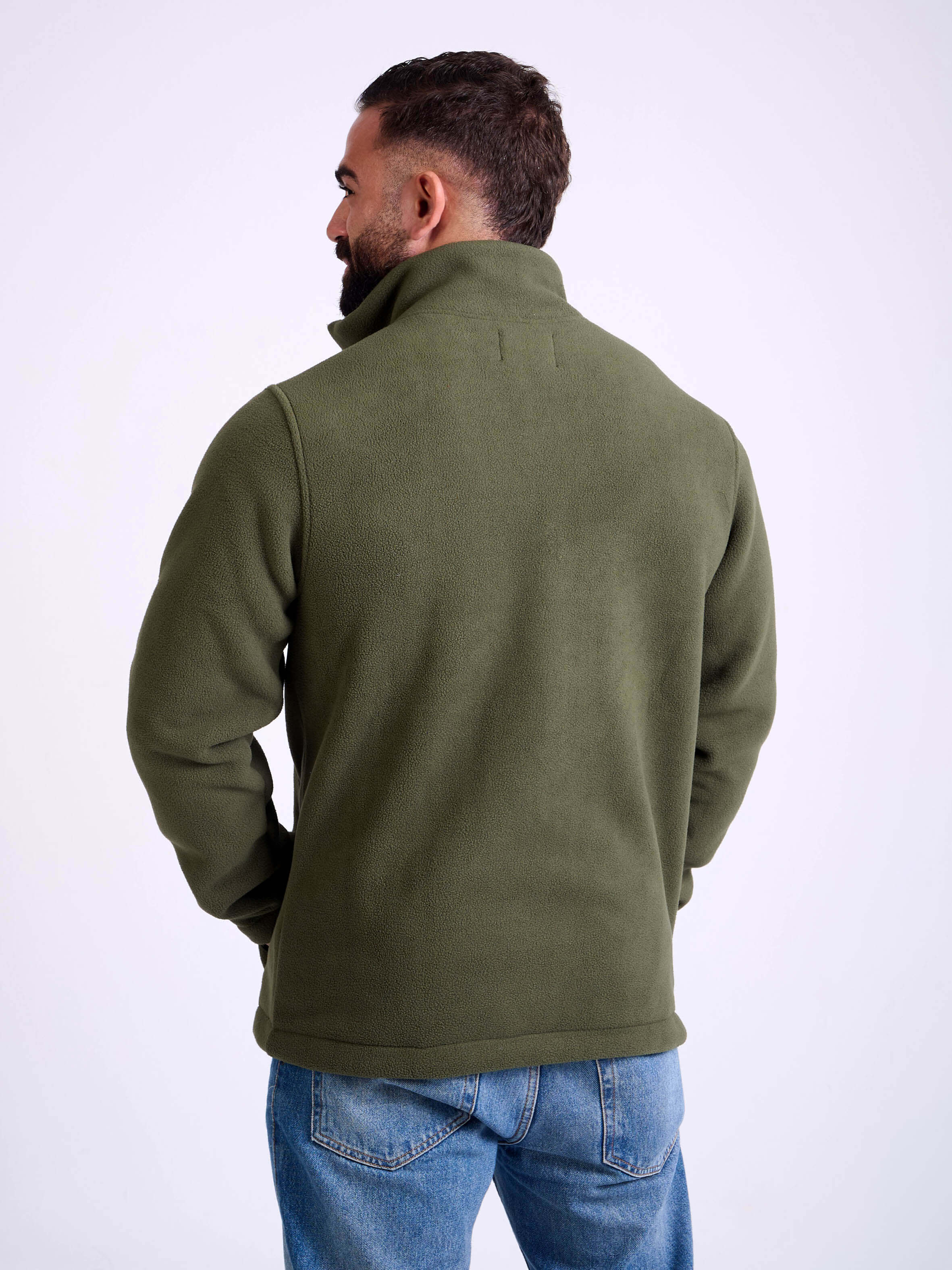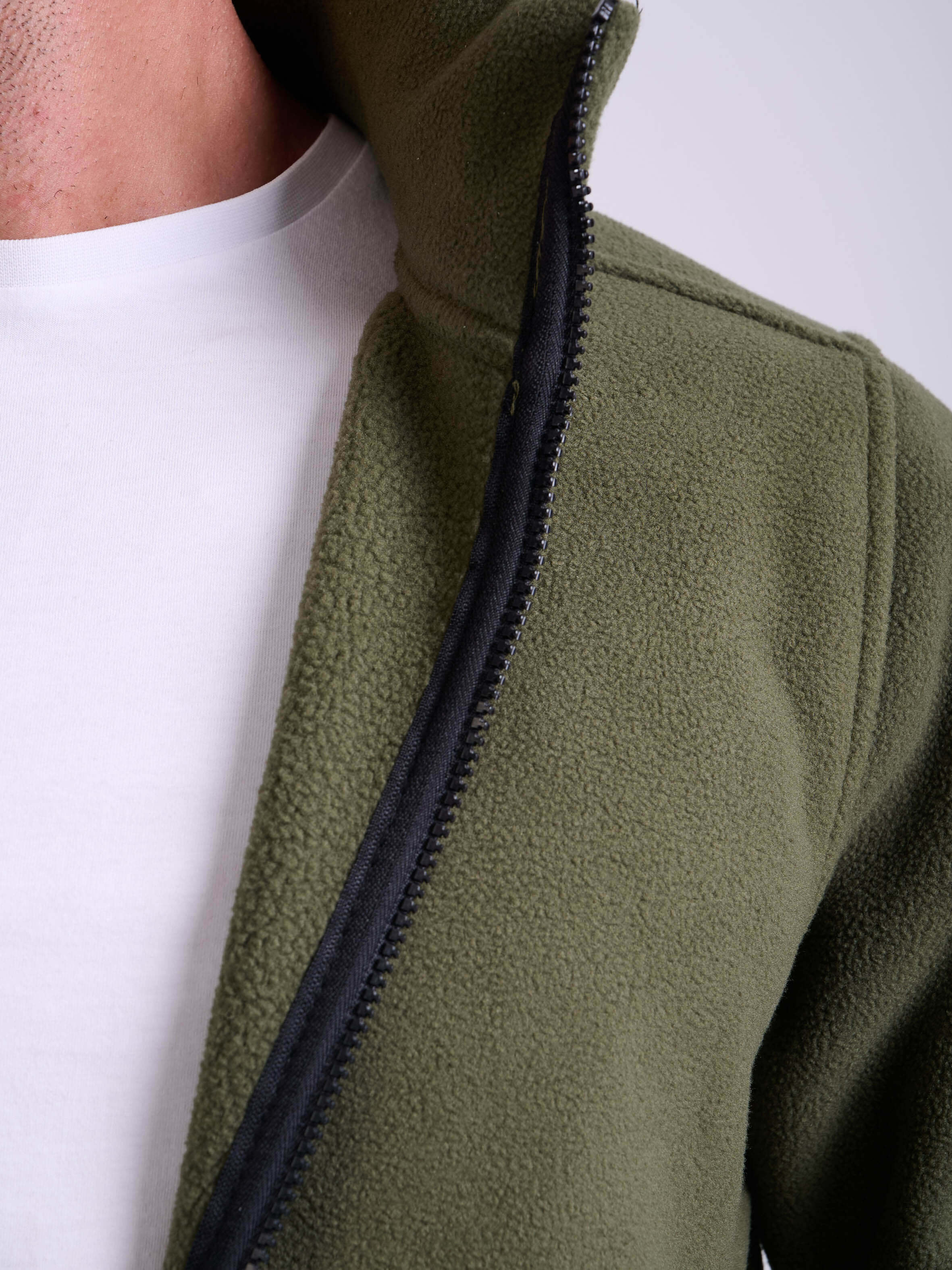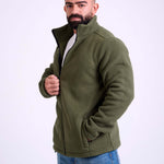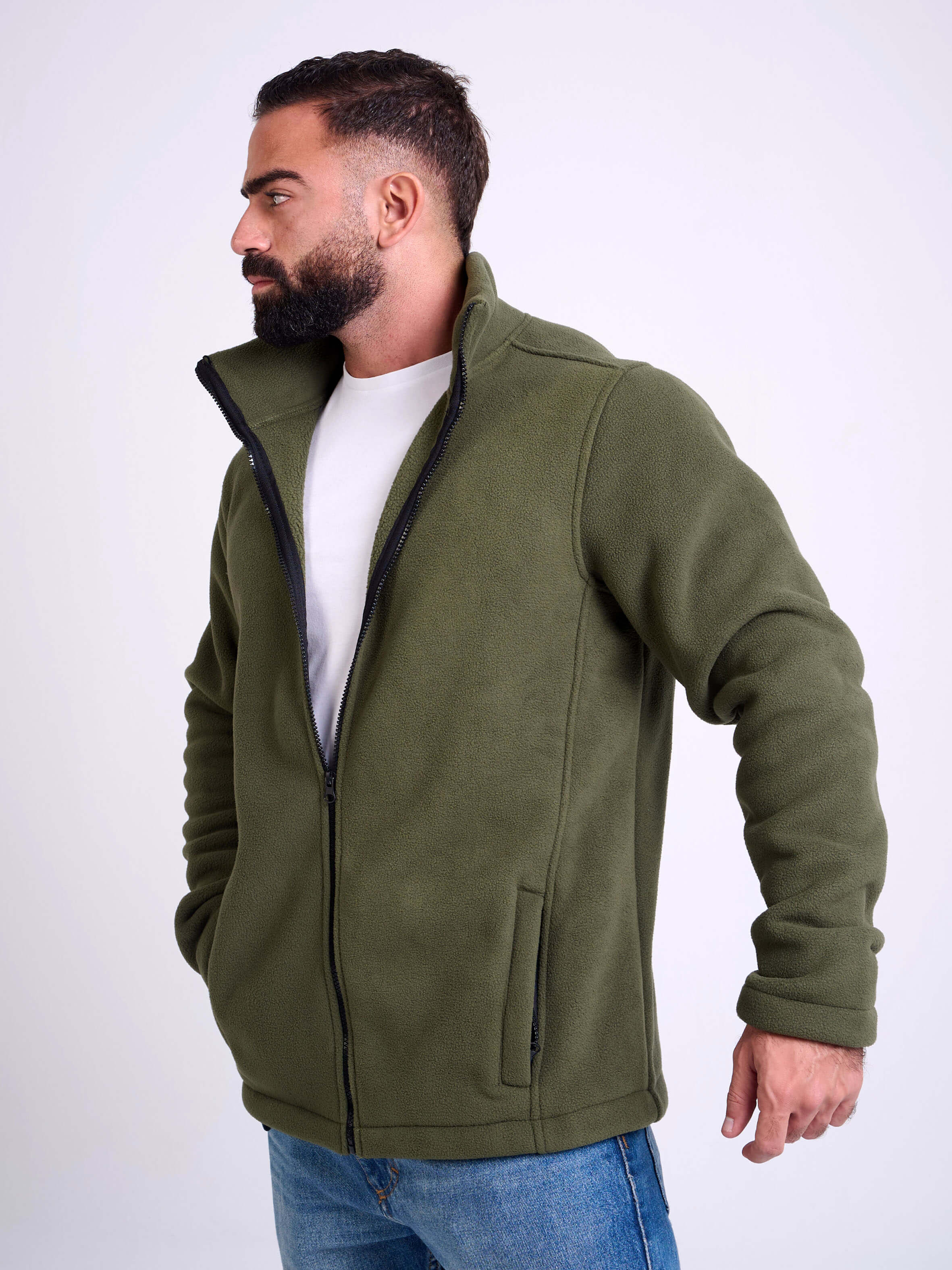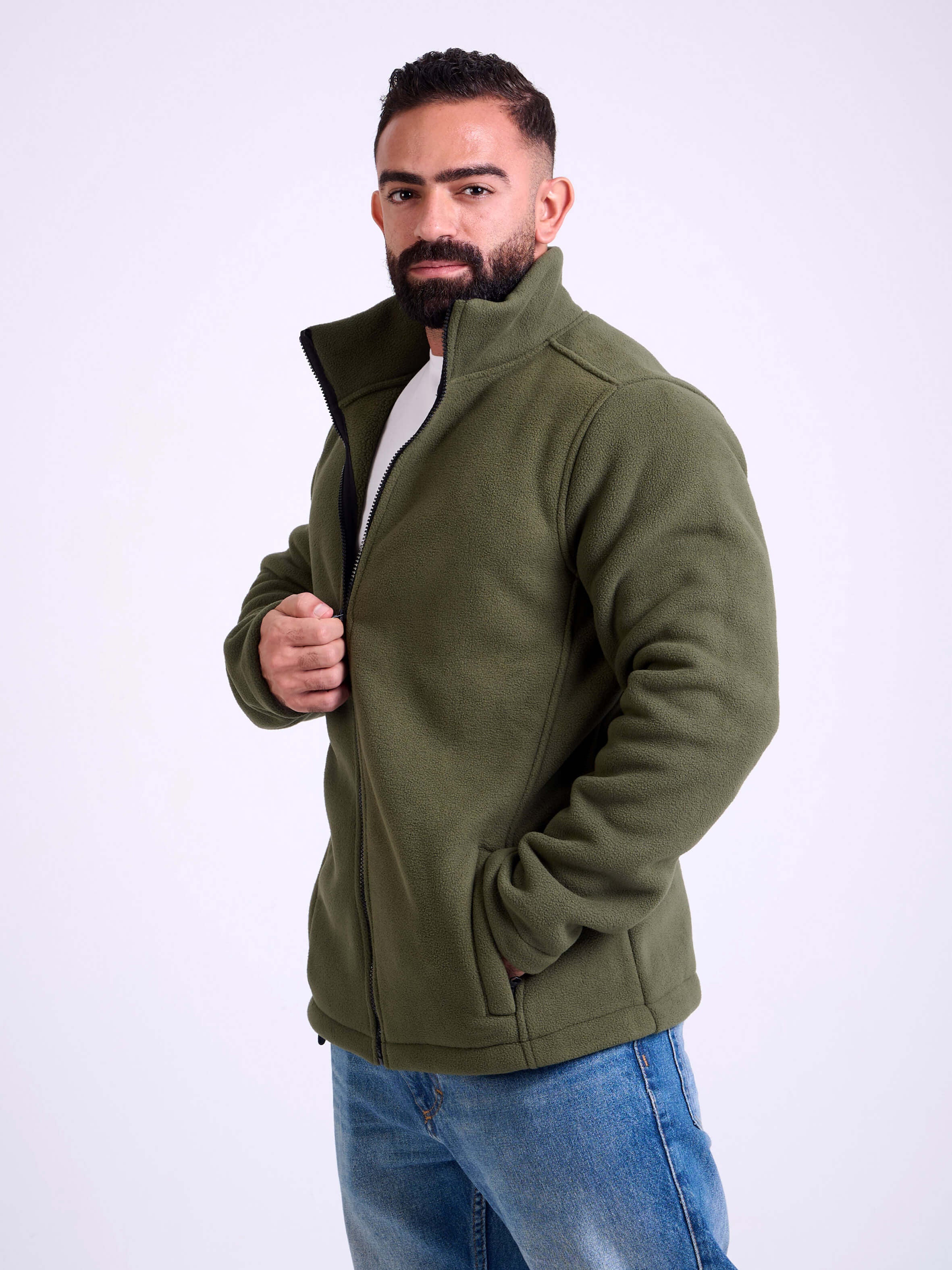 Man wearing a olive fleece jacket by KAF on a white background. Made in Egypt
