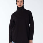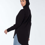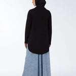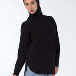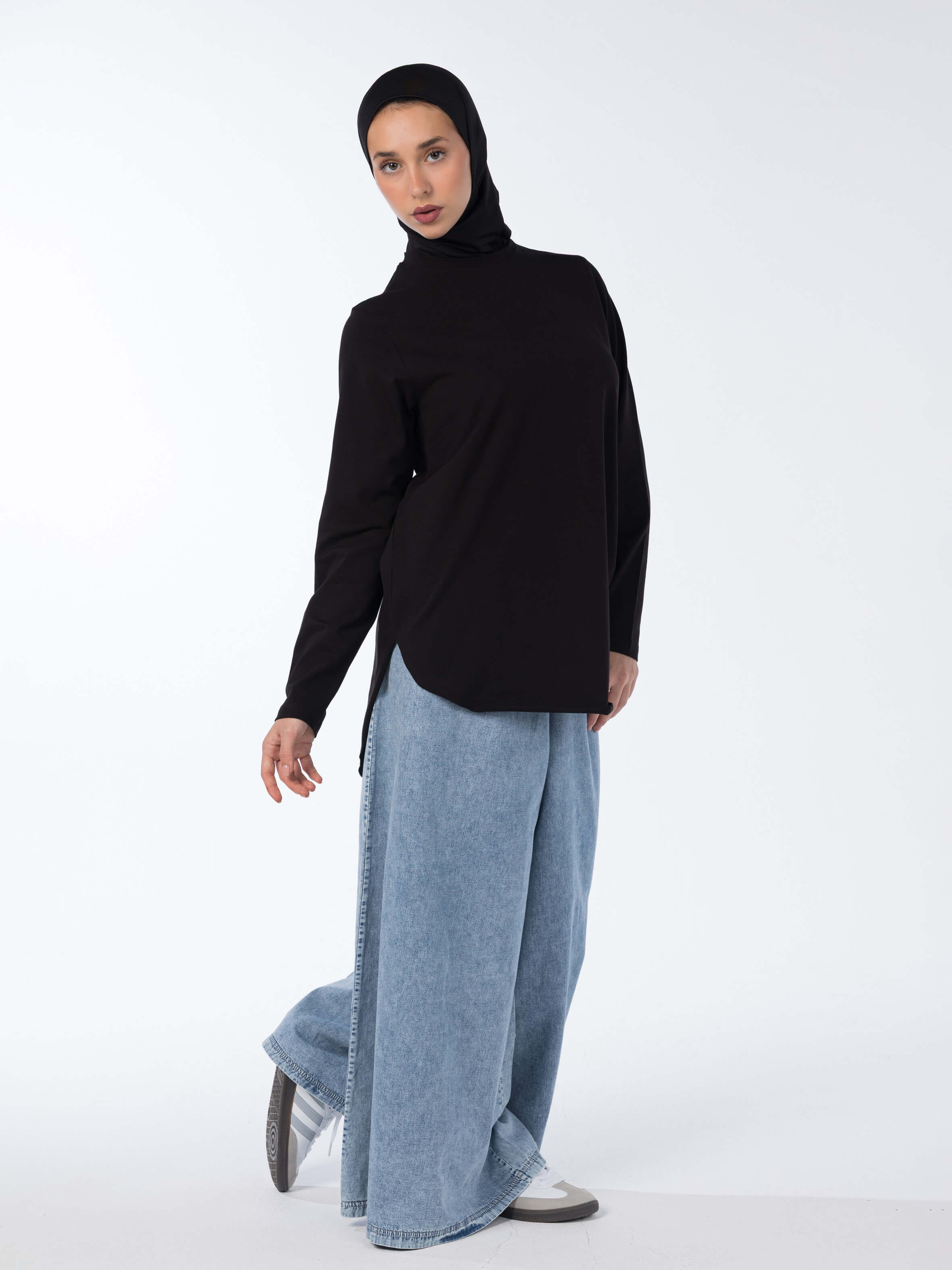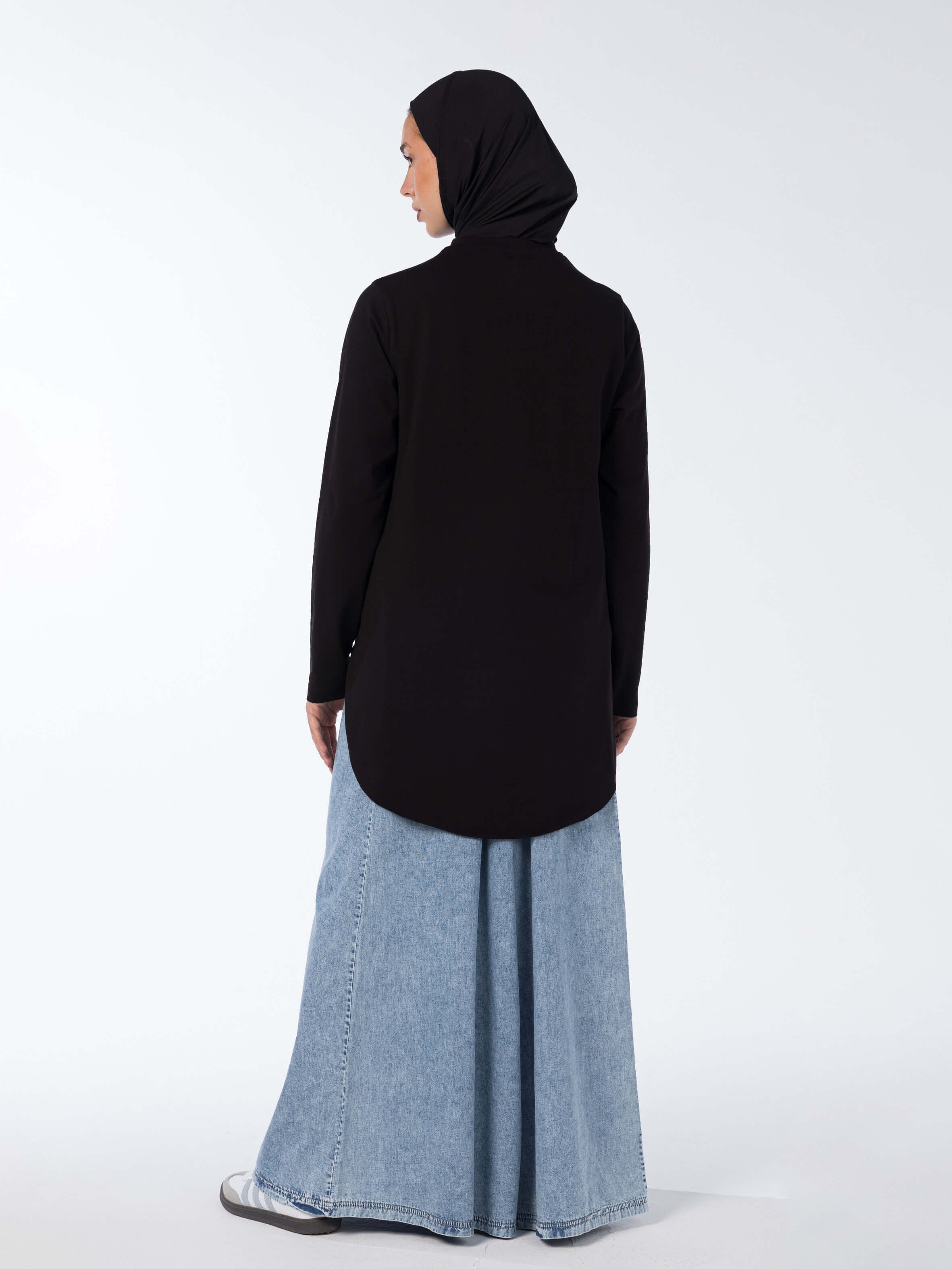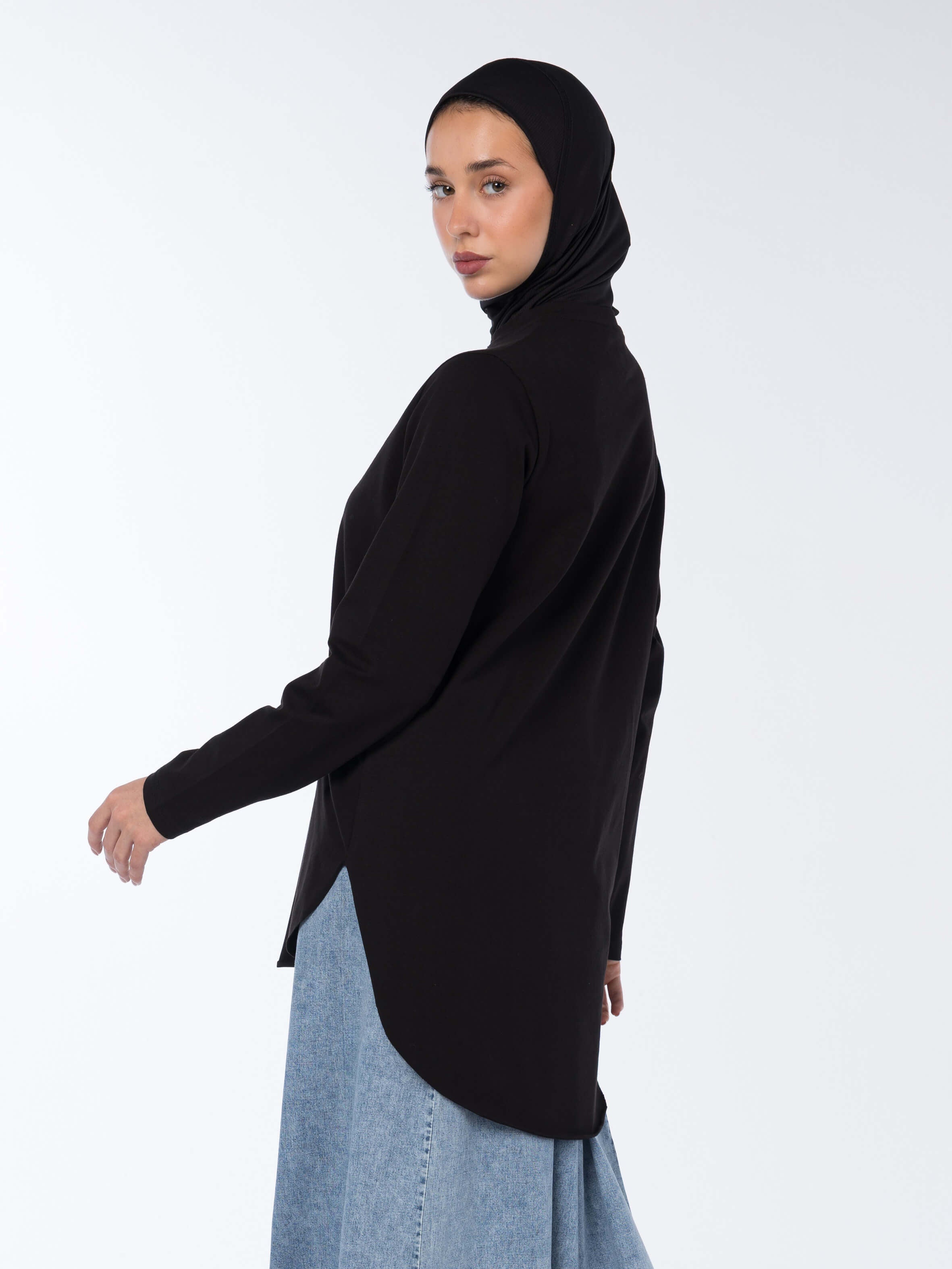 تيشرت قطني حريمي كم طويل بحافة عالنسل - أسود