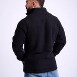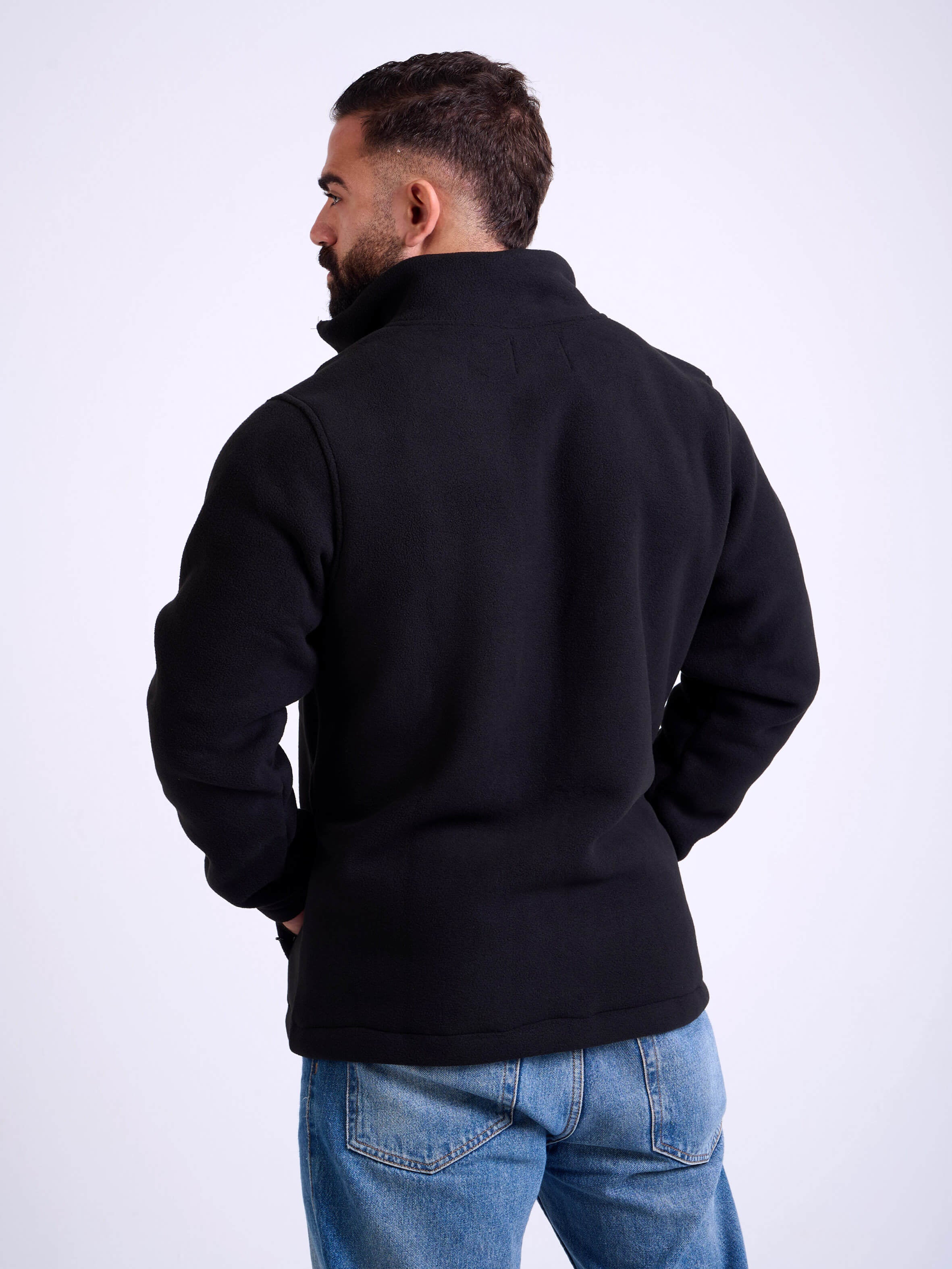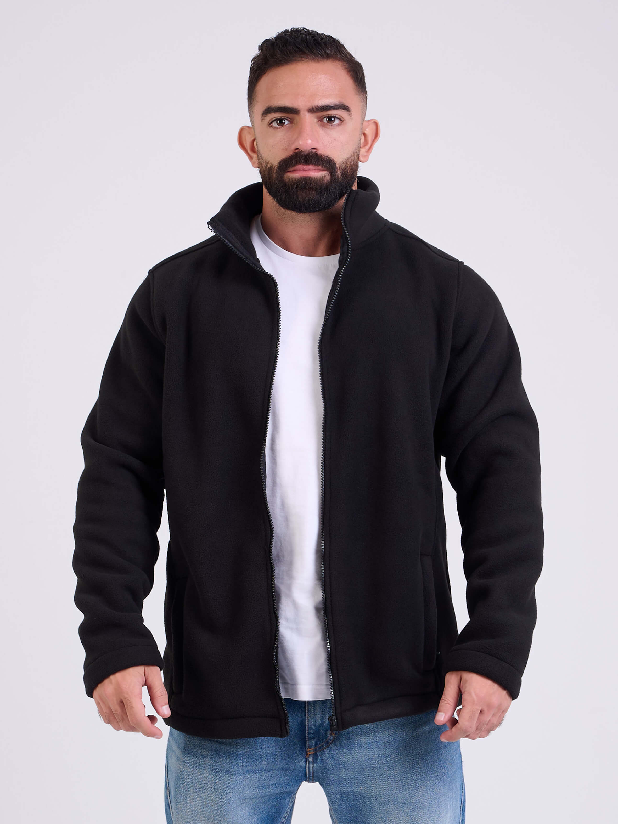 Man wearing a black fleece jacket by KAF on a white background. Made in Egypt