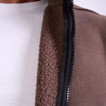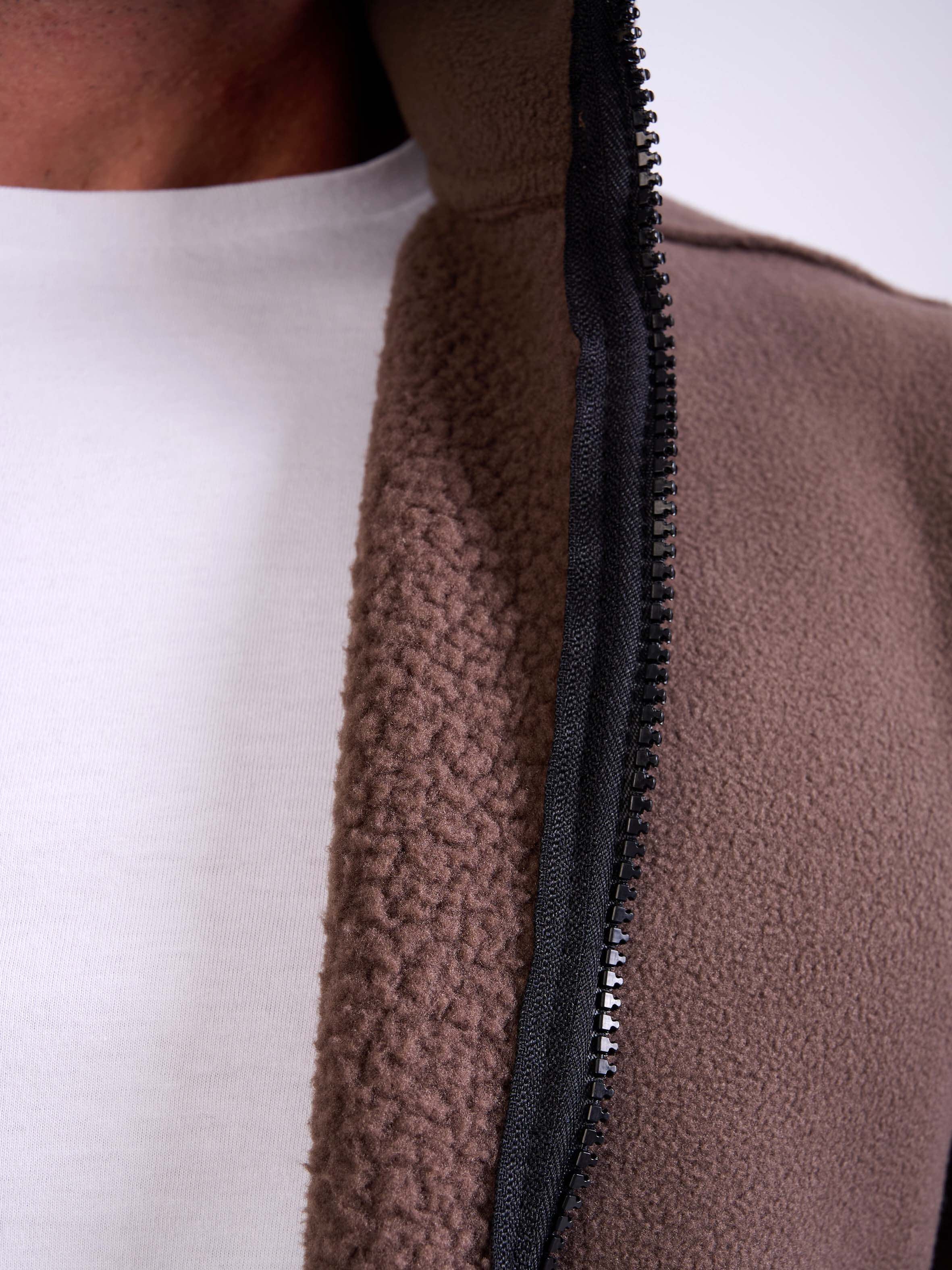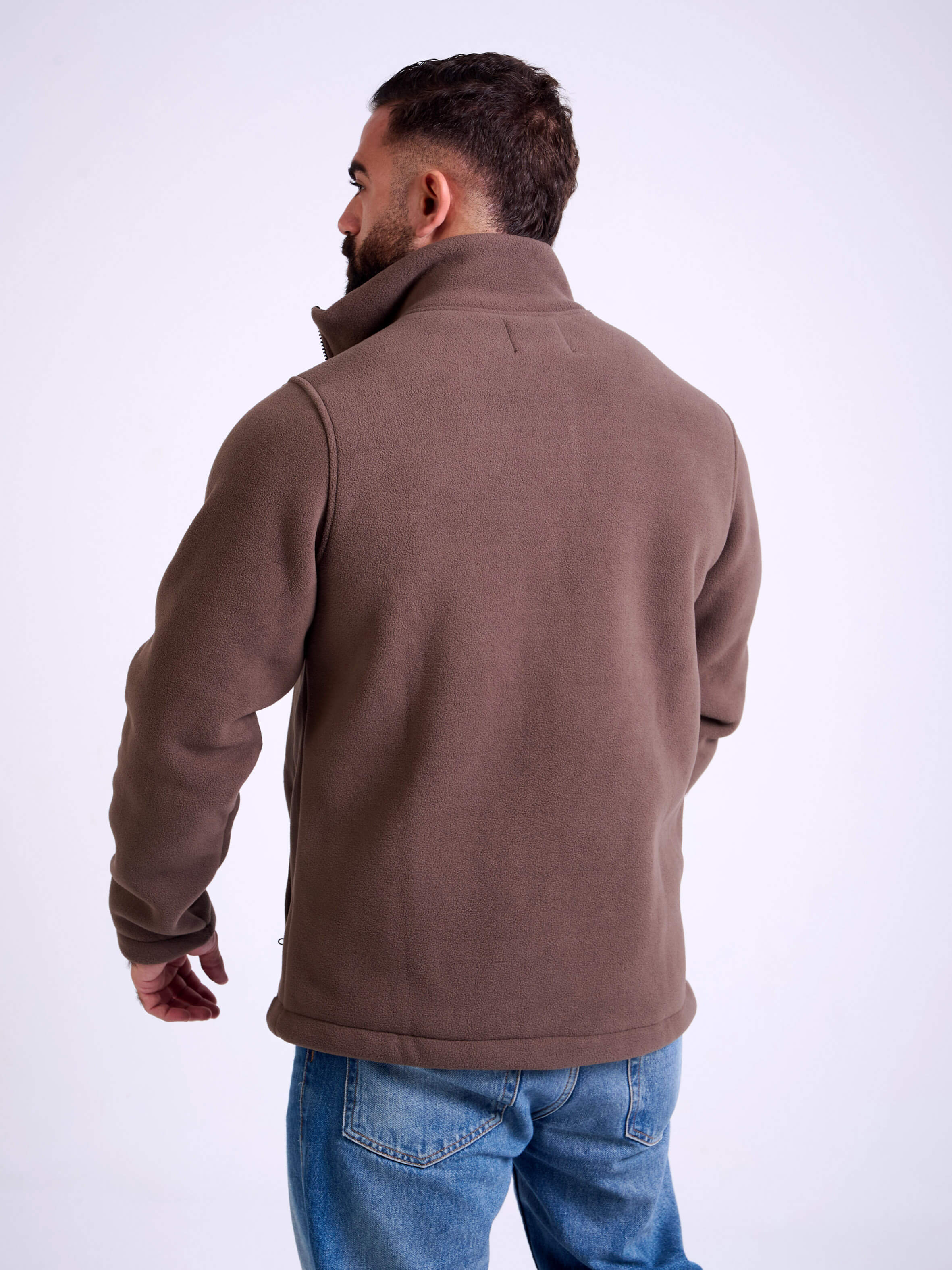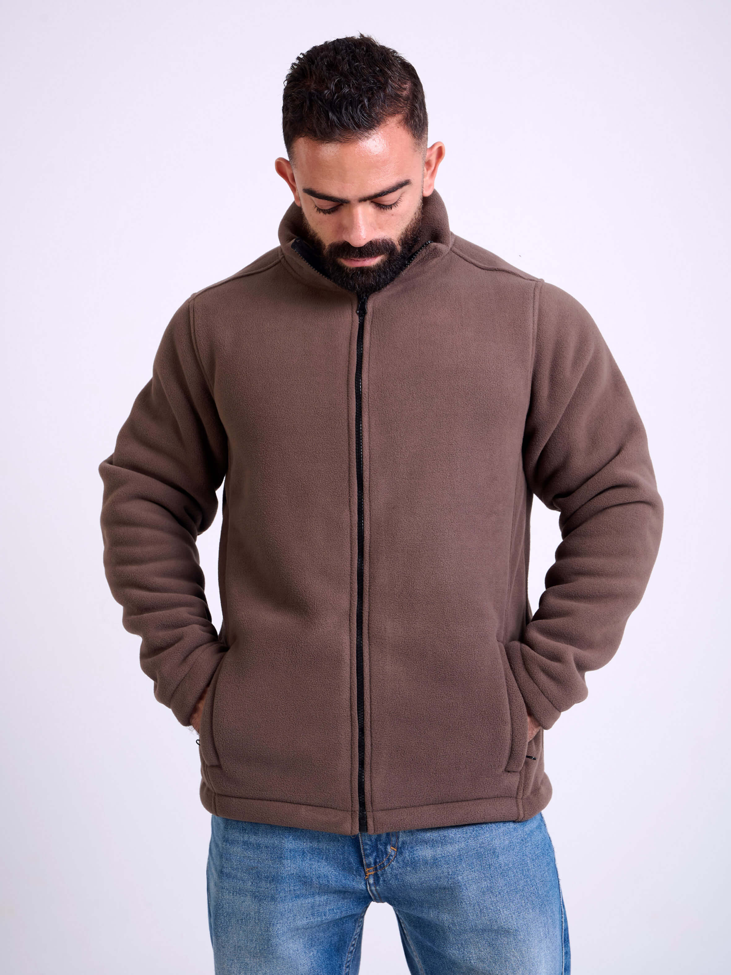 Man wearing a brown fleece jacket by KAF on a white background. Made in Egypt