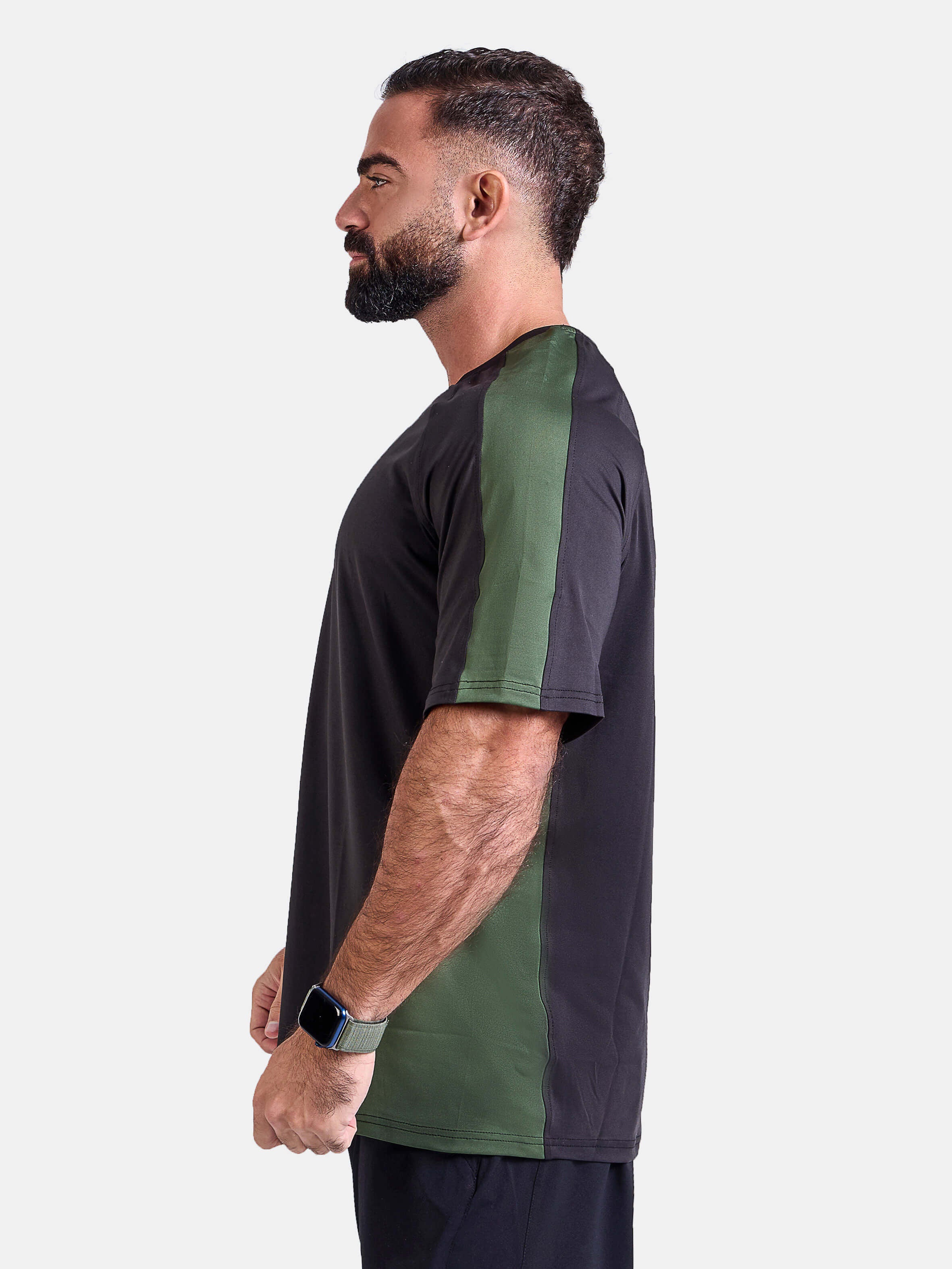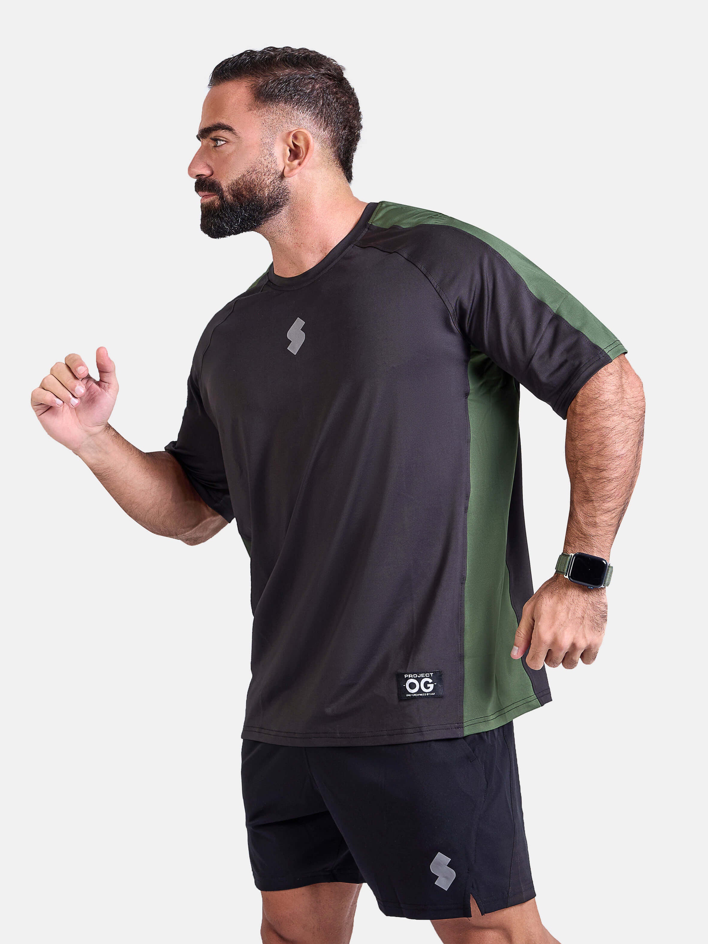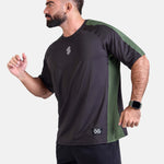 Man wearing a black and green oversized sports & gym shirt by KAF
