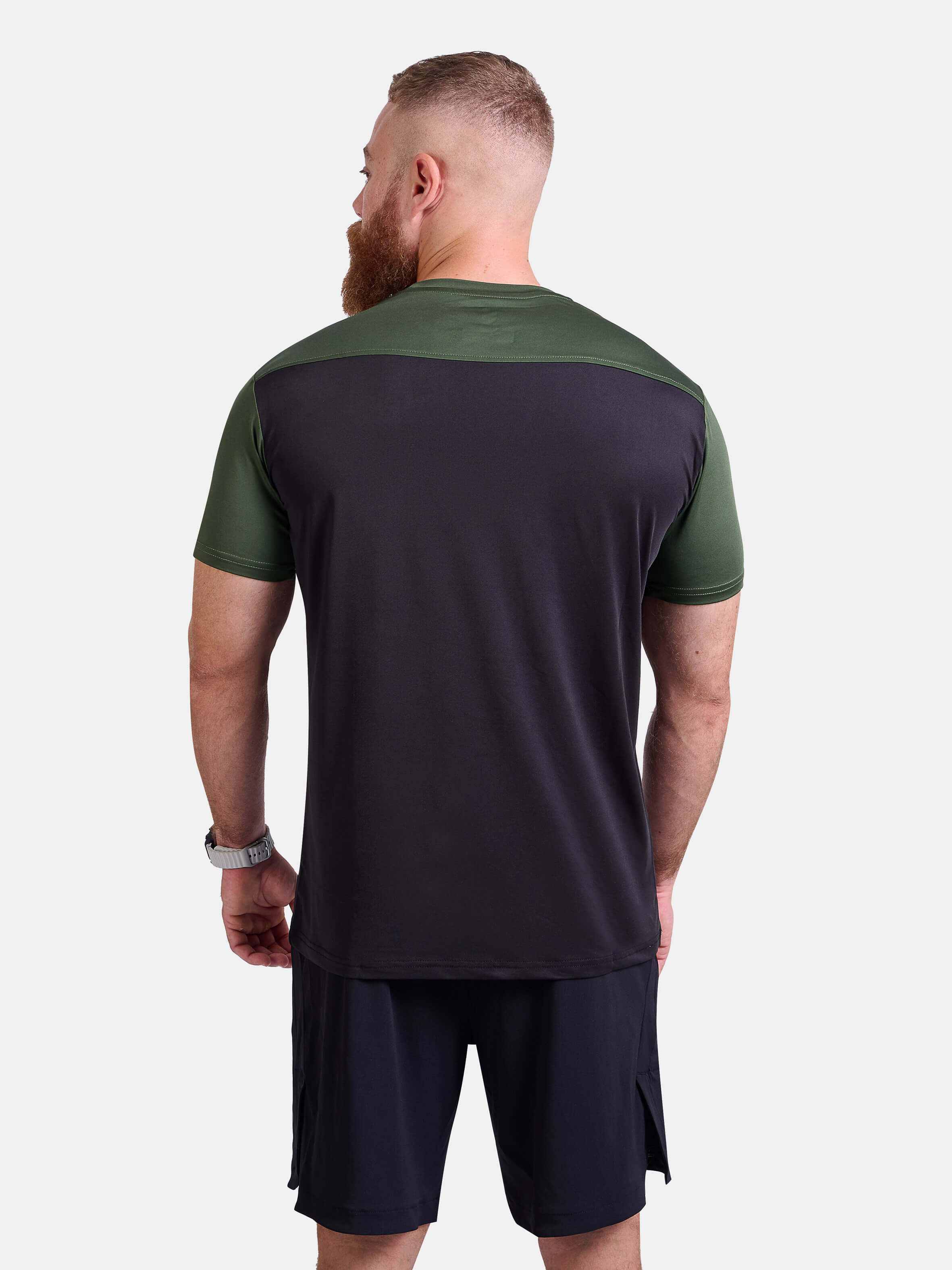 Man wearing black and green sports - gym - padel t-shirt by KAF Egypt